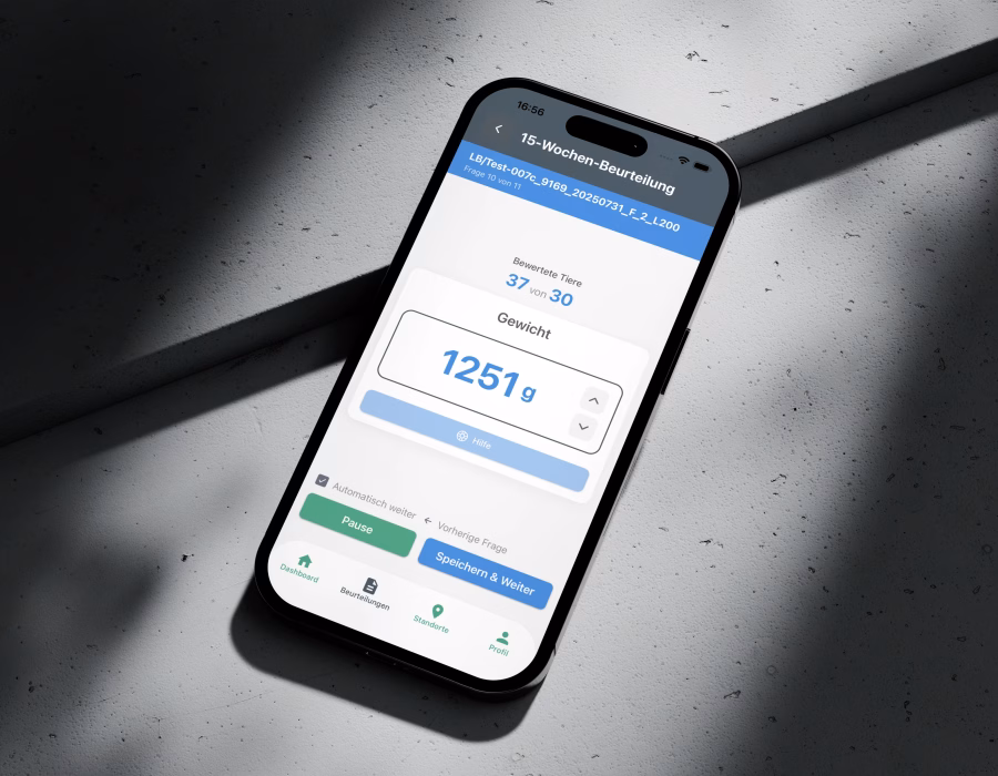 Our assignment to Laramate was to develop a mobile app for the digital recording of animal welfare assessments of laying hens in poultry houses. The focus was on a simple and clearly structured user experience to keep the barrier to entry low and ensure that all KAT participants could easily adopt the app.