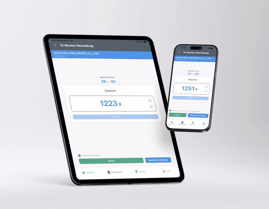 Durch die Offline-Fähigkeit läuft der gesamte Bewertungsprozess deutlich schneller. Pro Huhn dokumentieren Landwirte ihre Beurteilung mit 8 Bewertungsfragen und 1 Gewichtsmessung – das ergibt 9 Datenpunkte pro Huhn ergibt.
